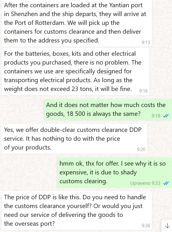 Odpověď: "Hi -jméno-, we have asked multiple shipping agent, DDP including claimable VAT is impossible for them. Because that required an official impoprt company to actually pay the VAT also. IF the ask a a local company to import and pay VAT in this way, the cost is even higher than your VAT cost. In the current DDP practice, all the products in one container are declared as low value goods to avoid hight tax and duty. Semms this kind of practice is very normal and common at customs of Netherland, Greece and Polands.