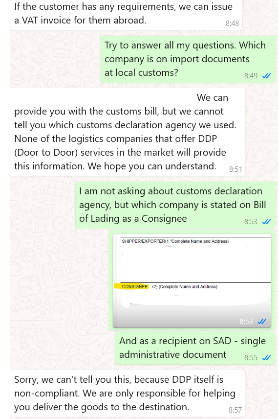 Dodavatel: "We will declare customs as normal, but regarding taxes on goods arriving in Poland, this is one of the things I don't know how freight forwarders make it legal to enter into Europe."